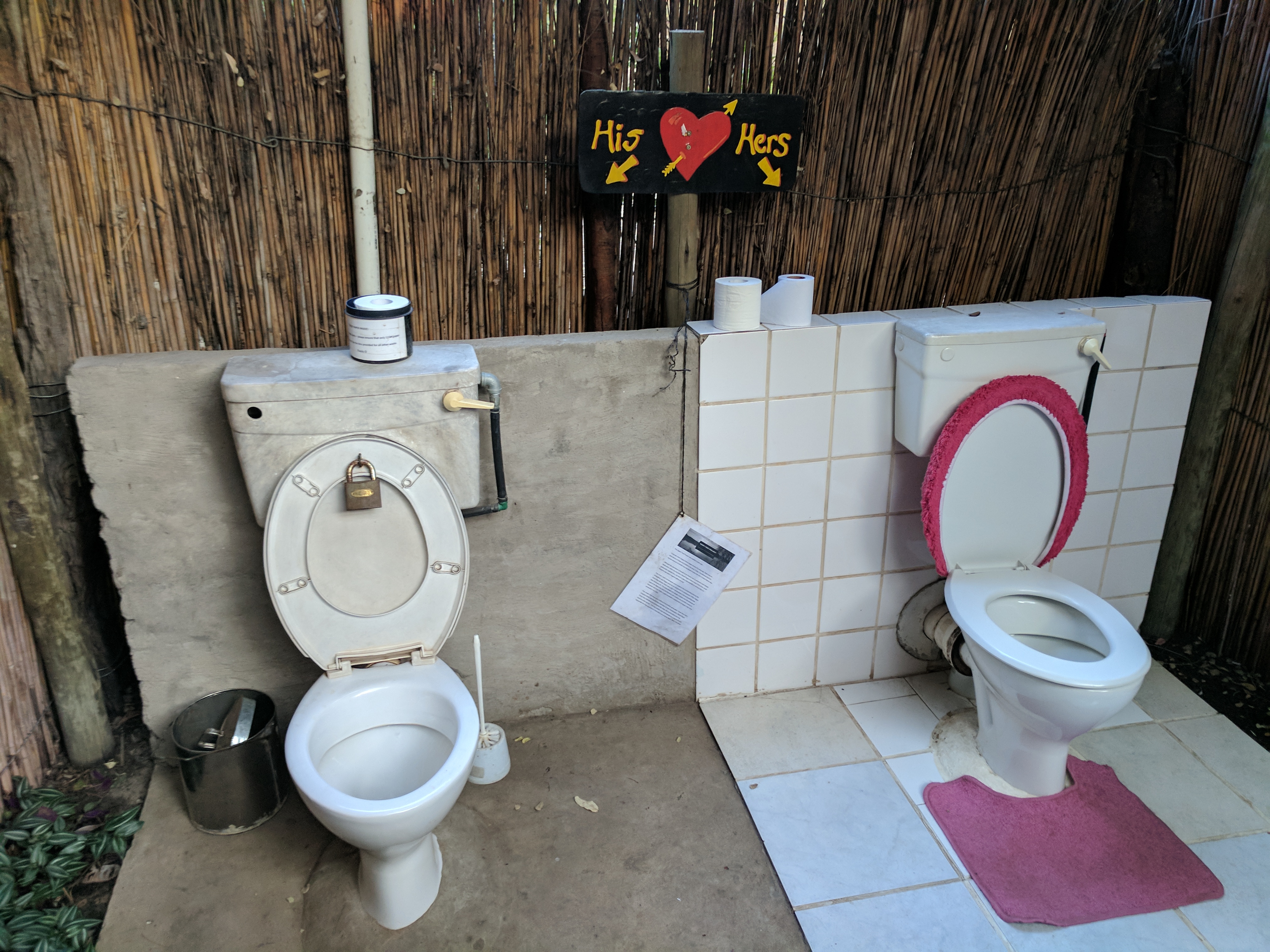 I pitched my tent right on the side of the river and marveled at the ridiculous outdoor bathrooms they’d set up. A family of hippos lazed in the river grunting 30 feet from where I’d set up. Afterwards, I headed back to the main building and enjoyed a buffet dinner with the South Africans, sharing stories of our respective adventures. The place was cute, so I decided to spend another day there to fully appreciate it. It was a pleasantly relaxing day, mostly spent riverside with my book. It felt great to relax away from Grootfontein. I spent another evening falling asleep to a cacophony of bird, insect, and other various animal noises the breadth of which I’d never experienced.